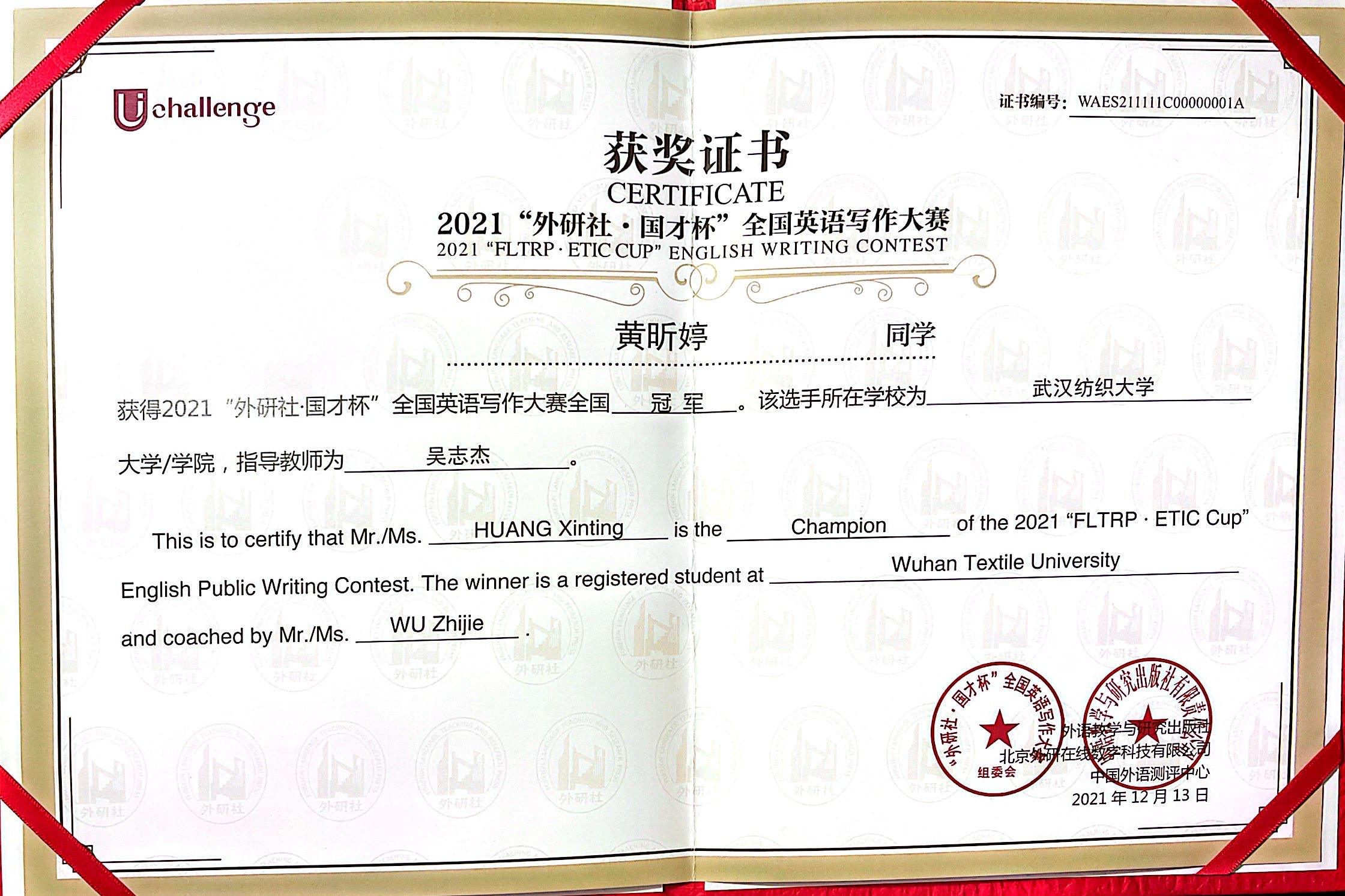 一分耕耘一分收获。黄昕婷在外研社杯·全国老员工英语挑战赛湖北省赛中一举获得特等奖。此后,在强手如林的全国赛中,她又获得国家二等奖。