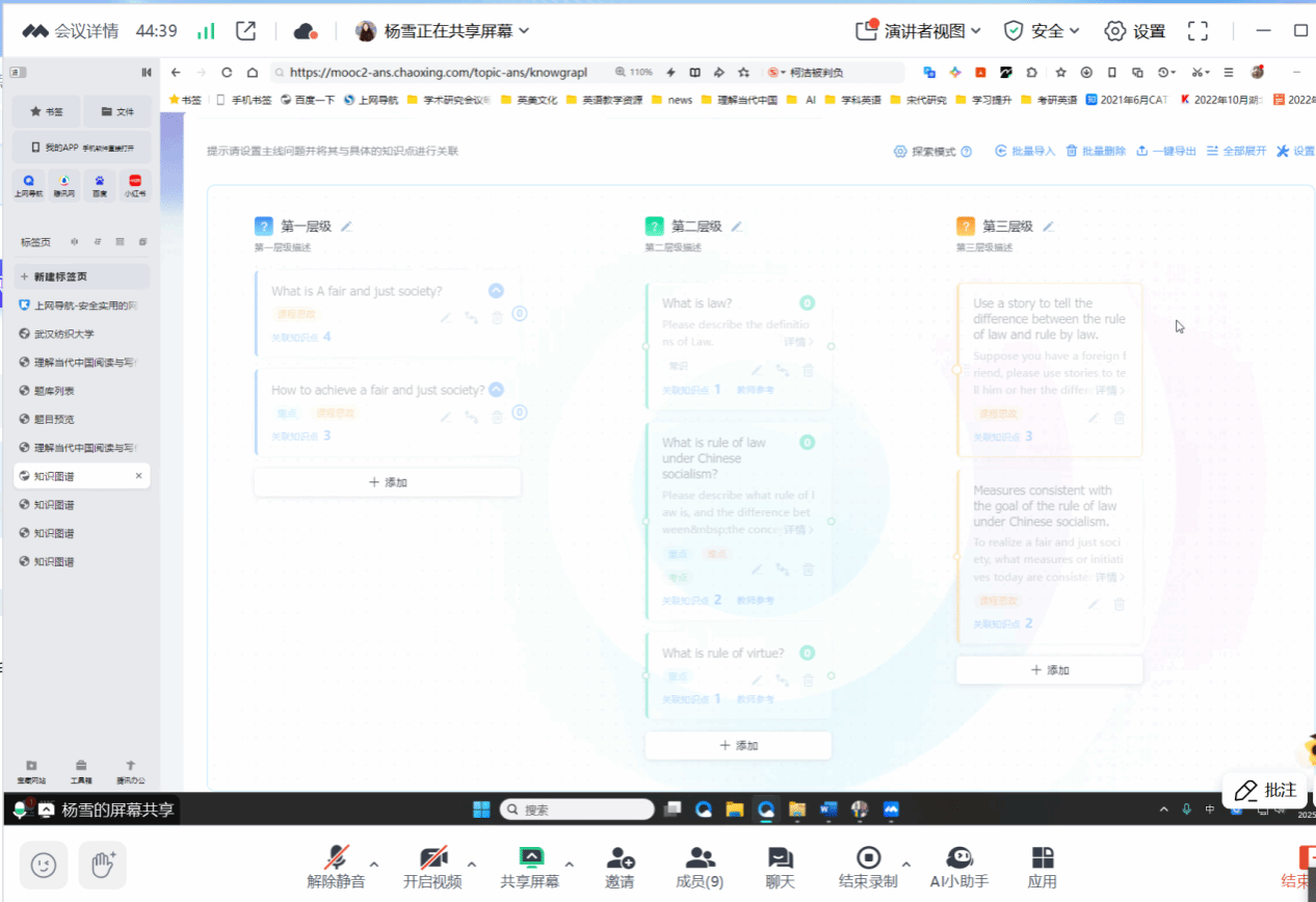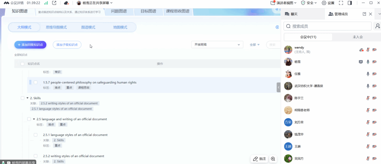 随后,杨雪老师分享了单元知识图谱的构建经验,详细介绍了知识图谱的原理、构建方法、实施步骤及最终产出形式。她结合课程实际,展示了知识图谱在课程内容梳理、知识点关联及学习路径优化中的应用价值。超星公司任雅老师受邀出席此次备课会,并对杨雪老师的知识图谱建设进行了现场指导,提出了针对性的优化建议。课程组成员对知识图谱进行了全面学习与热烈讨论,并根据课程内容需求,领取了各自负责的单元知识图谱建设任务。