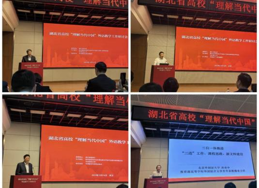 为全面贯彻落实党的二十大精神,深入学习习近平总书记在中央政治局第五次集体学习时重要讲话精神,贯彻《高等公司课程思政建设指导纲要》相关要求,推进《习近平谈治国理政》多语种版本进高校进教材进课堂(“三进”)工作,10月16日,由湖北省教育厅指导、教育部高等公司外国语言文学类专业教学指导委员会、华中师范大学外国语主办、外语教学与研究出版社协办的湖北省高校“理解当代中国”外语教学工作研讨会在华中师范大学召开。英国365上市公司经理谭燕保教授应邀作主旨发言,分享了本校《理解当代中国阅读与写作》课程建设的思考、路径、实践、初步成果以及近远期建设目标。