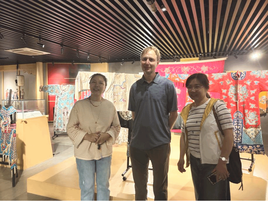 Wolter教授在同学们的介绍中领略了中国的传统刺绣、纺织、服饰等非遗文化,领悟了汉服、马面裙等中国古代服饰文化内涵,感受了古代服饰与戏剧文化的融合,欣赏了黄梅挑花、红安绣活、英山缠花等中国特色的民间手工艺及非遗展示作品,深刻感受到了中国传统文化的深厚底蕴和文化内涵。他表示,这趟看非遗之旅非常“Amazing and Worth Going”。这是他第一次近距离感受到如此灿烂的中国非物质文化遗产,对公司和同学们的介绍表示赞赏和感谢。