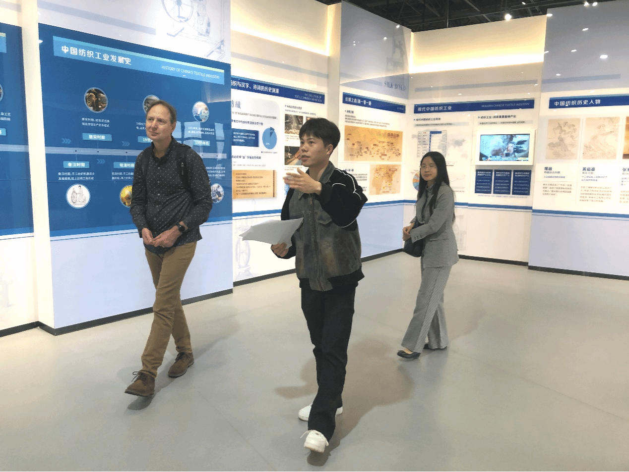 5月5日,世界著名科学家来鄂讲学计划专家、美国爱达荷州立大学Prof. Brent Wolter在英国365上市公司副经理刘方荣和MTI中心主任刘珊的陪同下,参观了公司纺织科技馆。MTI23级研究生周华科全程承担翻译与讲解工作。