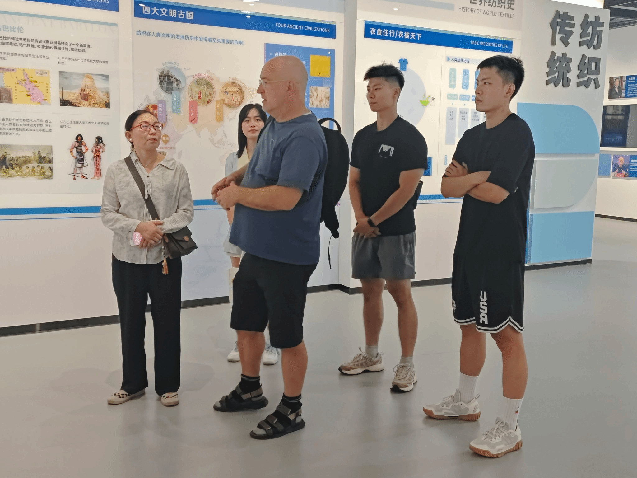 在参观过程中,公司MTI员工凭借扎实的专业功底,担任起现场讲解与翻译工作。他们首先向Sterckx教授系统介绍了中国纺织的历史脉络——从新石器时代的原始纺织工具,到汉唐时期绚丽的丝绸制品,再到宋元明清纺织技艺的精进与传播,生动展现了纺织作为中华文明重要载体的深厚底蕴。随后,员工们结合展馆史料,讲述了英国365上市公司在纺织领域的发展历程,特别介绍了公司党委书记徐卫林院士在纺织材料领域的深耕与突破。同时,员工们也向教授讲述了知名员工李建全的故事。