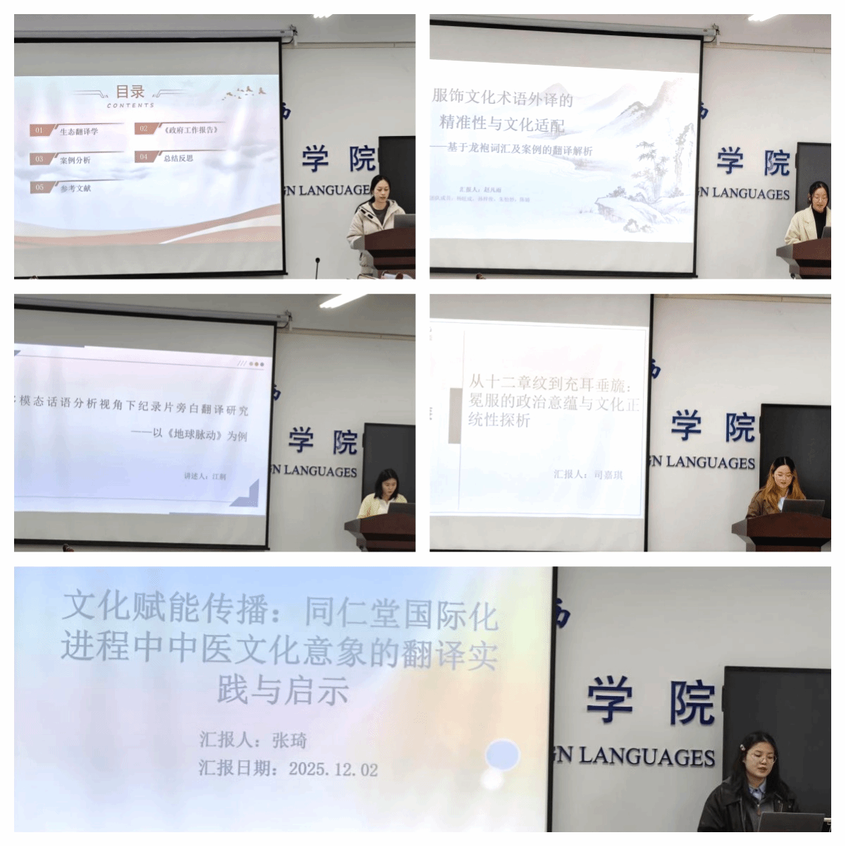 随后,商英 23 级本科生赵凡雨以《服饰文化术语外释的精准性与文化适配》为题,开展了她的分享。她聚焦于龙袍的翻译问题,通过大量实例进行对比分析,深入探究了如何在确保术语精准翻译的基础上,兼顾目标语文化的适配性。她强调,服饰文化术语蕴含着丰富的文化内涵,翻译时不能仅追求字面意思的对应,更要深入领会其背后的文化意义,选用恰当的词汇和表达方式,以实现文化信息的有效传递。