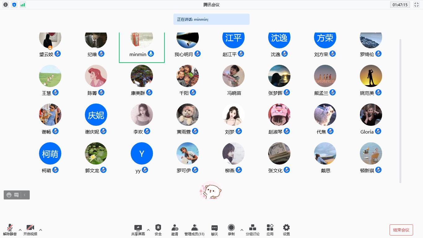 最后,罗经理对本次研讨会进行总结,充分肯定了研讨会的举办形式以及两位主讲同学的精心准备,表扬两位同学的分享各自有特点,逻辑思路清晰,纪维同学讲解清楚到位,具有很强的实效性;王慧同学发音清晰准确,有口译方面的潜质。同学们经过MTI教学以及导师的引导,再加上定期的学术交流,学习能力有了质的飞越,并希望大家以后的学术研究能做的更加精深细致。此外,罗经理针对本次学术沙龙也提出了宝贵建议:一是建议发言人打开摄像头,重视这种正式会议的礼节;二是建议纪维同学的分享若结合一篇具体文章或者实践翻译文本,总结长句翻译技巧,效果会更好;王慧同学要敢于质疑老师的参考翻译,鼓励同学培养大胆的探索和创新精神,对前辈的质疑精神贯穿研究始终。