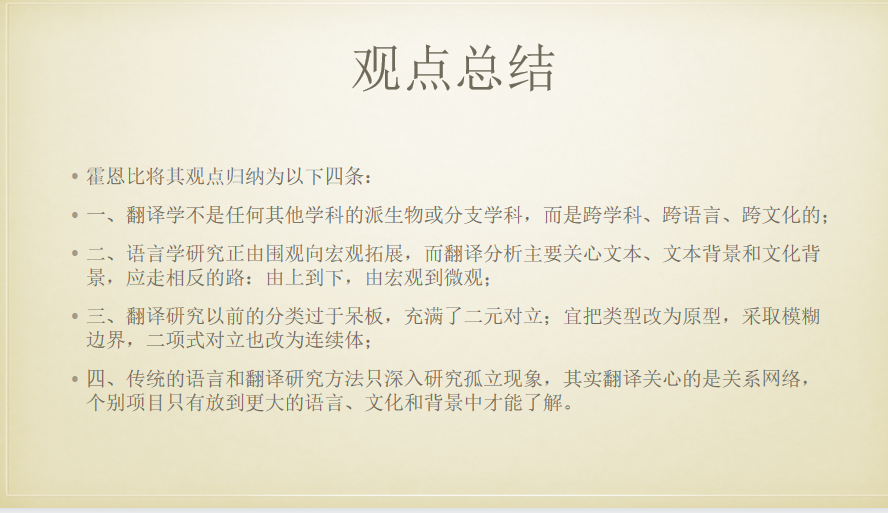 第二位展示者21级MTI研究生于天伦同学以“斯奈尔·霍恩比与翻译研究综合法”为题,对斯奈尔·霍恩比的生平和著作分别进行了介绍,接着对于《翻译研究——综合法》中的莱比锡学派和操纵学派进行了比较研究,然后介绍了格式塔理论和原型范畴理论,最后霍恩比将其观点进行了总结归纳,得出“翻译学不是任何其他学科的派生物或分支学科,而是跨学科、跨语言、跨文化的”。于天伦同学还给大家分享了《西南联大英文课》,选取了几个段落进行了解读,也阐释了自己的想法。