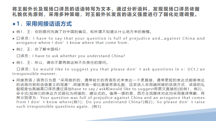 20级MTI研究生徐小月同学以“外交语言翻译研究——从礼貌优先到礼貌效率并重”为主题,介绍了政治语境下外交译员坚持的“礼貌优先”原则的局限性的三个表现进行的讨论。通过语料分析,口译员在现场翻译时对王毅部长发言的语义强度进行了弱化处理调整。比如:采用间接话语方式、增添模糊限制语、省译人称代词及否定内容和增添程度副词的多种策略。随后,她对2021年10月22日外交部例行记者会上外交部新闻司副司长汪文斌的答记者问进行了深刻解读,对于其中外宣文本的遣词用句,以及长难句的分析做了深刻解读。最后,徐小月同学也给同学们提出了四个句子的翻译问题,黄雨萱、郭文龙、陈家乐和左灿同学分别发表了自己的看法并给出了译文。