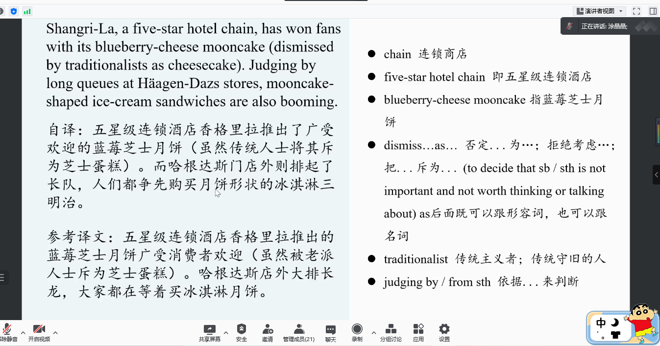 涂晶晶同学分享的主题是外刊阅读与翻译练习,摘录自外刊文章“What a controversial pastry says about China's economy”,讲解主要从三个维度展开:文本介绍、翻译过程与分析对比、总结反思。涂晶晶同学首先介绍了的文章的主题内容:常人和经济学家眼中月饼的差异,以及月饼成为经济趋势风向标的原因,并用实例证明月饼市场火热,同时对文章的段落大意进行了改述。紧接着,对比分析了自己的译文与参考译文,并介绍了翻译过程中遇到的疑难点,如hockey puck、nut-and-egg-yolk fillings等词的翻译,同时也讲解了自己查证的资料和翻译的依据。最后,涂晶晶同学进行反思总结,从写作和词汇表达的角度,对文章的框架和内容进行小结,首先提出论点... are among the most divisive ...,然后用For some...,For others...句式引出双方论据,后面用but引出新的观点,然后回顾反思有关词汇句式表达的知识点,指出了自己翻译过程中的不足,如查证的资料不充分,句式不能灵活运用,双语能力待提高等,最终总结学习就是一个不断进步和积累的过程,积少成多的碎片化知识对以后的学习和翻译实践会有很大的帮助。