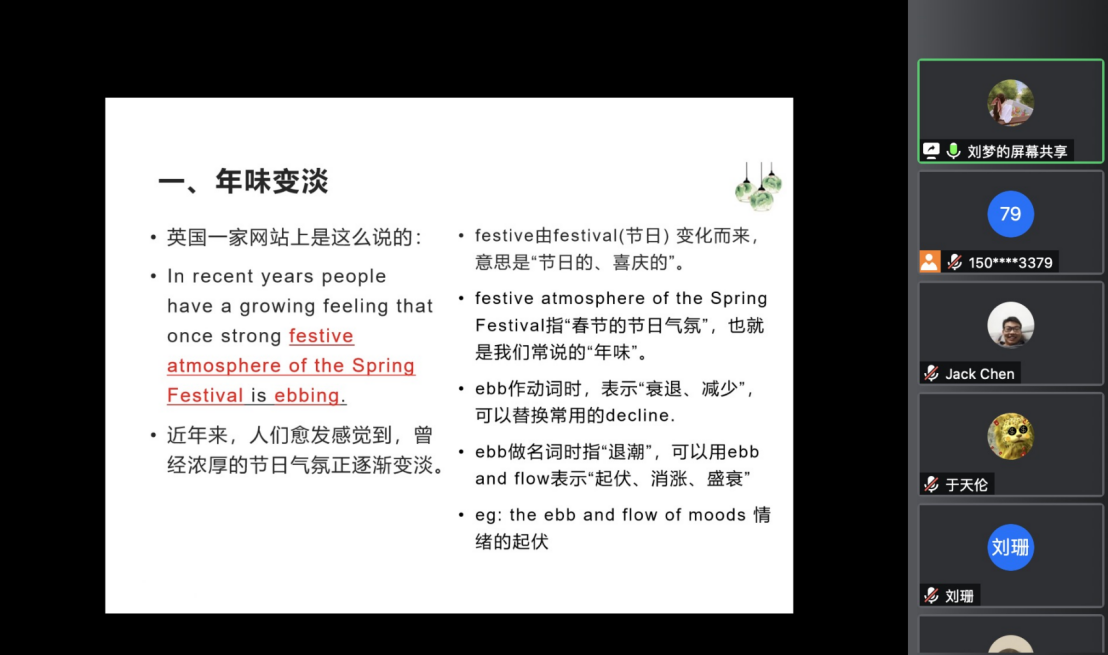 刘梦同学给大家分享了她的翻译练习,主题是“过年焦虑”,内容分为四部分。分别为:年味变淡、繁琐的春节习俗、催魂、亲戚的唠叨。