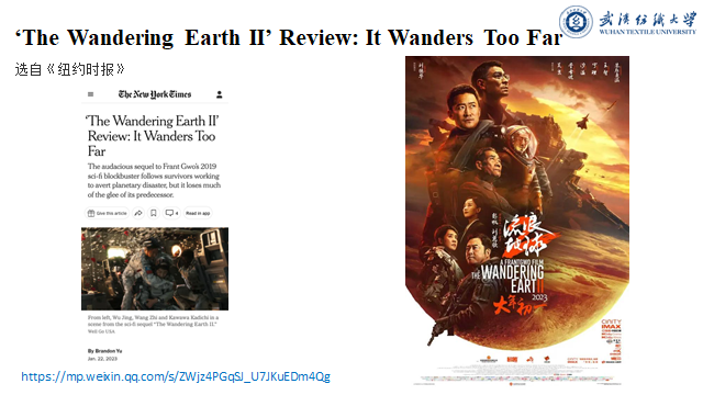 第三位汇报人22级MTI研究生郑凡琳与我们分享的是外刊影评评析及影视片名翻译赏析。其中外刊影评评析部分,郑凡琳同学选取电影《流浪地球》的一篇国外影评为例进行分析,对该影评进行部分摘取,通过自己的分析再次翻译并与参考翻译进行对比分析。郑凡琳同学通过自己对影片的理解以及结合外国媒体对《流浪地球》情感色彩的分析,将其翻译得绘声绘色,生动形象,获得了老师们的一致好评。此外,在对影视片名的翻译上,郑凡琳列举了今年春节档热映的几部电影进行分析,指出影片片名翻译不仅要传达出中国电影的味道也要符合西方观众的理解,可采取直译、意译、音译、音译加直译和音译加意译等方法,让同学们对影片翻译有了新的认识。
