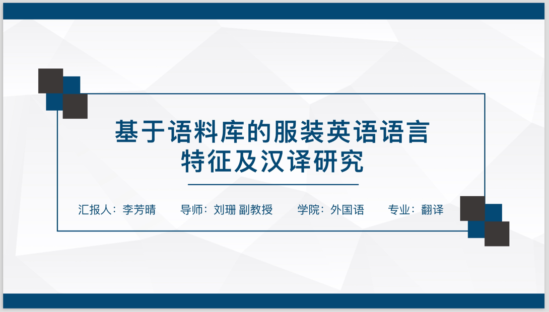 汇报人李芳晴同学分享的题目是:基于语料库的服装英语语言特征及汉译研究。该研究通过将服装英语语料库与通用语言语料库进行对比分析,探寻服装英语的语言特征,根据服装英语的语言特征,从词汇和句子这两个层面来探究服装英语的翻译策略。此外,李芳晴详细介绍了如何自建服装英语语料库以及如何运用语料库检索软件进行分析。