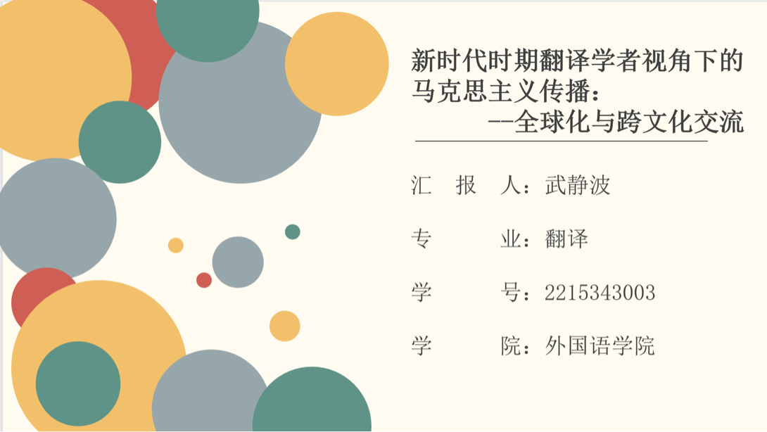 汇报人武静波同学分享的题目是:新时代时期翻译学者视角下的马克思主义传播—全球化与跨文化交流。武静波同学指出翻译工作者作为传播的关键人物,应承担起责任和使命,具备专业素养和技能,为马克思主义的全球传播提供积极的支持和贡献。同时,全球化和跨文化交流也对马克思主义传播提出了新的要求和挑战,需要翻译工作者具备更广泛的视野和更深入的理解,以更好地适应和应对当今复杂多变的传播环境和挑战。