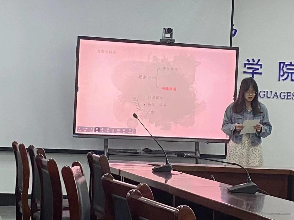 第一位汇报人万祎岚同学分享的主题是浅析《涉美国中情局,中方重磅曝光!》的翻译。万祎岚首先简介了硬新闻的概念,接着分享自己的翻译实践,并与官方译文做了对比分析。万祎岚大量举例,说明Chinese和China's的区别,并分享了一些缩略词中这两个词的具体用法,最后和大家讨论了“打一枪换一个地方”这句话的翻译。