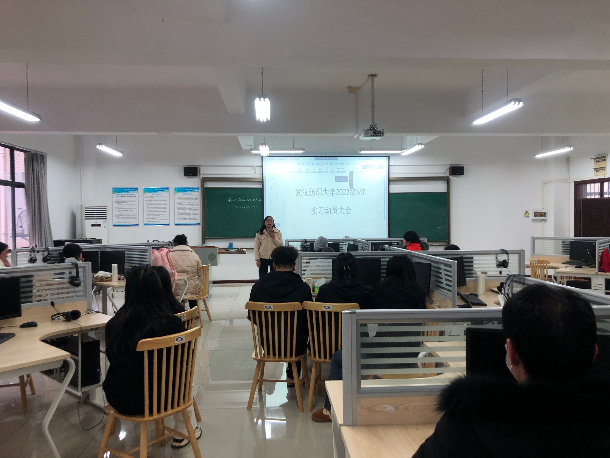 12月12日下午3:45,在四号教学楼306教室,MTI教育中心召开了22级研究生实习“经理答疑课”,全体22级研究生在线下、导师在线上全程参与了该会议。动员大会由副主任陆雪芹主持,副经理刘方荣负责宣讲实习实践的有关要求并现场回答了员工们的相关疑问。