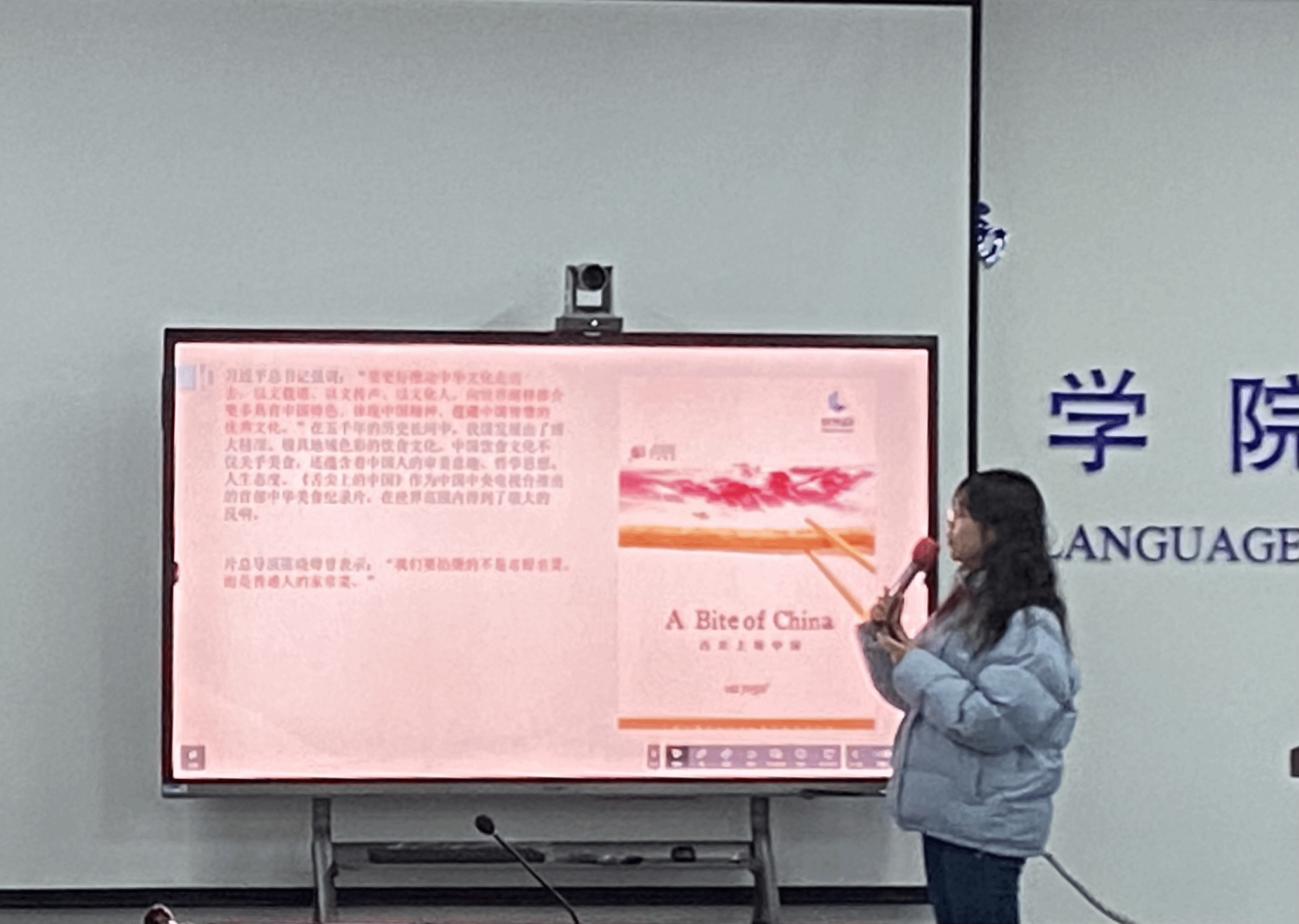 第一位分享人李祖悦同学的分享主题是《“舌尖上的中国”字幕翻译研究》。她从三个方面探讨字幕翻译在美食节目中的翻译方法,分别是说辞、音律和引经据典。她深刻探讨了如何在保留原汁原味的同时,使得口述文化和美食传承得以最真实地呈现在观众眼前。她的演讲引发了与会者对于文化传播与翻译艺术的共鸣与思考。