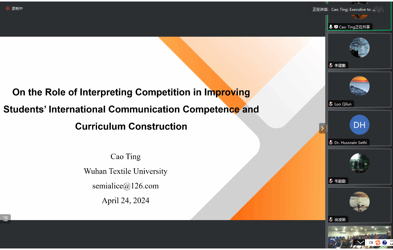 24日下午的会议由副经理罗绮伦和巴方教师共同主持。曹婷在会上做了“口译竞赛在提升员工国际交流能力和课程建设中的作用”的主旨报告。她指出在今天的国际交流中话语权是不平等的。英语是国际交流的主要语言。全世界应用最广的社交媒体多数主要来自美国,这就导致西方发达国家占有话语权优势。国际新闻主要关注发达国家,不发达国家很少被关注甚至被忽略。口译竞赛能提升老师的研究能力和员工的国际交流能力,口译大赛成了学术界和语言服务的桥梁。最后曹婷简要介绍了中国的各种口译竞赛。