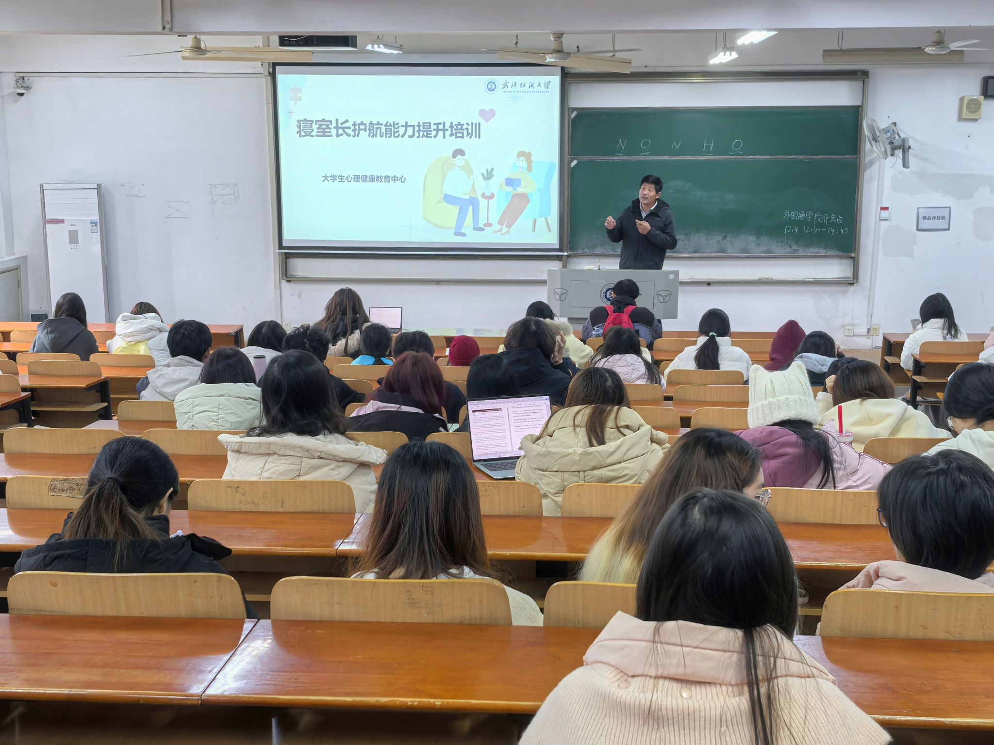 培训中,赵宝富老师围绕寝室长的角色定位、工作内容与原则、常见心理问题的识别与应对、倾听技巧以及自我关怀等方面进行了系统讲解。他明确指出,寝室长不仅是日常生活的管理者,更是同学心理健康的“第一道防线”,承担着生活秩序维护、心理健康支持、人际关系协调、信息枢纽传递和自我成长示范五大核心职能。