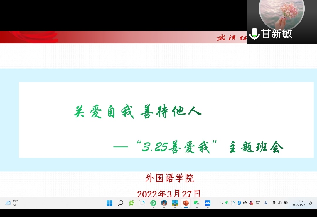 本次班会通过PPT演讲、播放心理宣传相关视频等多种形式宣传了心理健康相关知识,讲述了系统的心理调节方法,并鼓励同学们做一个有责任、有担当、身心健康的新时代青年。学习结束后,同学们还进行了交流,喻蕾同学说:“希望我们一起关爱自己、关注身边的每一个人,希望在这个春暖花开的时节,我们都能向花儿一样绽放。”