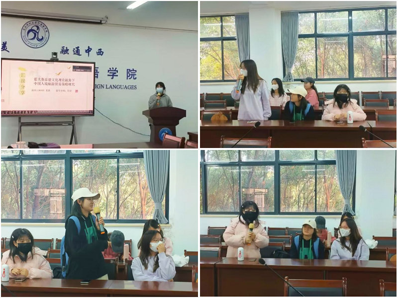 论坛开始,樊静宣同学以省级大创项目为题,探讨了法语联盟对于孔子公司发展的启示以及后期发展规划。对此,黎健老师认为,项目负责人应结合宏观、微观进一步挖掘解决途径,为本项目的后续发展提供了方向与指导。何昊然同学对《简爱》一书深有思考,从自我成长观,择偶观,爱情观,爱情地位来分析女性主义,引发了大家对于新时代女性主义的思考。叶可同学从学科竞赛角度分析了竞赛对于个人成长、学术思维、就业思维等各方面的联动影响,强调了“问题意识”的培养与实践。朱腾同学分享了自己这学期的毕业论文选题与思路,同步分享了如何平衡学习与活动、毕业与毕设的问题,通过她的分享,同学们发现课堂中听课的导向不仅仅是知识,更要有学术,只要有问题、感兴趣,就可以借此做研究,以学术推动学习、用学习再次反推学术。商英12201罗浩诚同学则从一则新闻的主角、挖到其音乐作品、继而从其典型作品中挖到其体现出的文化、教育、历史等,生动演绎了如何从现象看到本质、从学习到学术的过程。