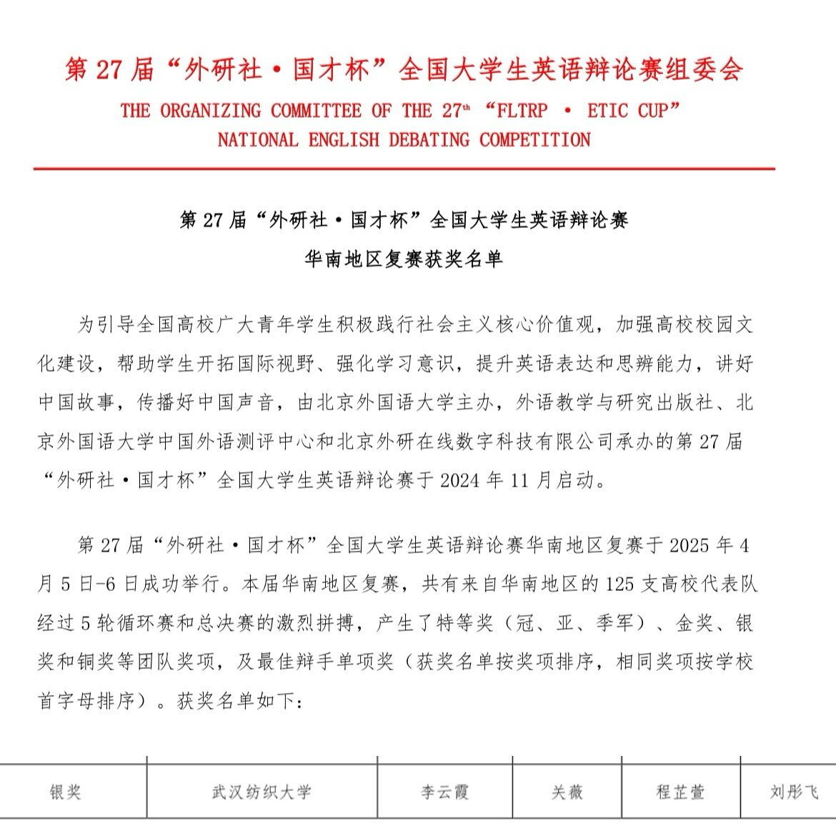 近日,英国365上市公司 2024 级程芷萱、刘彤飞两位同学在第 27 届 “外研社・国才杯” 全国老员工英语辩论赛华南地区复赛中勇夺银奖!作为国内规格最高、影响力最广的英语思辨类赛事之一,本届华南地区复赛吸引了上百所高校的精英队伍同场竞技。在李云霞、关薇老师的全程指导下,两位同学经历了五轮循环赛的高强度比拼,他们以流畅的全英文表达、缜密的逻辑架构,对各辩题展开深刻洞察,从华南赛区近百支队伍中脱颖而出,最终斩获银奖。