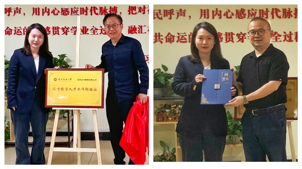 会上,柯群胜和秦学姐一同为公司“人才工作联络站”揭牌,彭阳慈航向秦学姐颁发公司“就业指导与生涯规划导师”聘书。