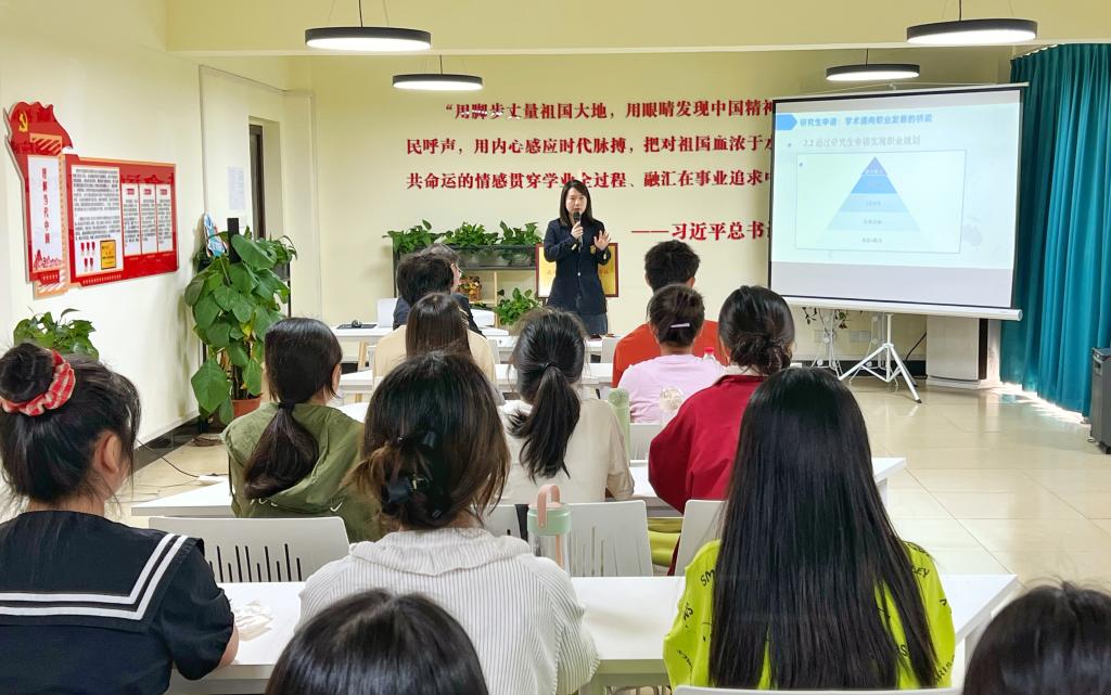 秦学姐结合自身行业和成长经历,在大学学业、求职就业、出国交流、人生规划等方面作了指导。她用自己成功考研武汉大学、成功申请到出国留学的经历,建议同学们提前了解外界,放眼世界,掌握考研和出国的相关信息。最后,秦学姐勉励学弟学妹们做好大学规划,包括巩固专业知识、参加学科比赛、考取相关证书等,积极努力,多做尝试,立足当下,打好大学“基本盘”。