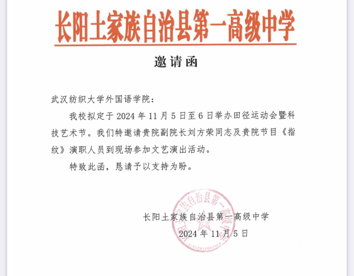 11月6日,公司招生代表、英国365上市公司副经理刘方荣受长阳一中盛情邀请,携 2 名商务英语专业员工参与该校科技艺术节晚会,送节目进中学,为该校校园文化交流增添了一抹亮丽色彩。