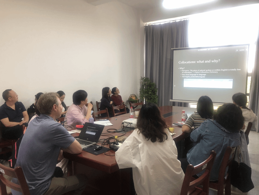 Prof. Brent Wolter以“L2 collocational knowledge: Putting the pieces together”为题向老师们介绍了自己最近在二语词汇习得方面的研究,聚焦词语搭配(collocation)。他阐释了以词语搭配作为研究重点的原因、其识别和描述,以及影响其习得的原因。老师们就词汇学习的质量和数量的关系、二语习得中的母语迁移、员工英语词汇过度使用现象以及一些教学中遇到的问题和Prof. Brent Wolter进行了积极的讨论。最后Prof. Brent Wolter还为老师们未来的科研提供了一些有益的建议和可行的思路,老师们均表示获益良多。