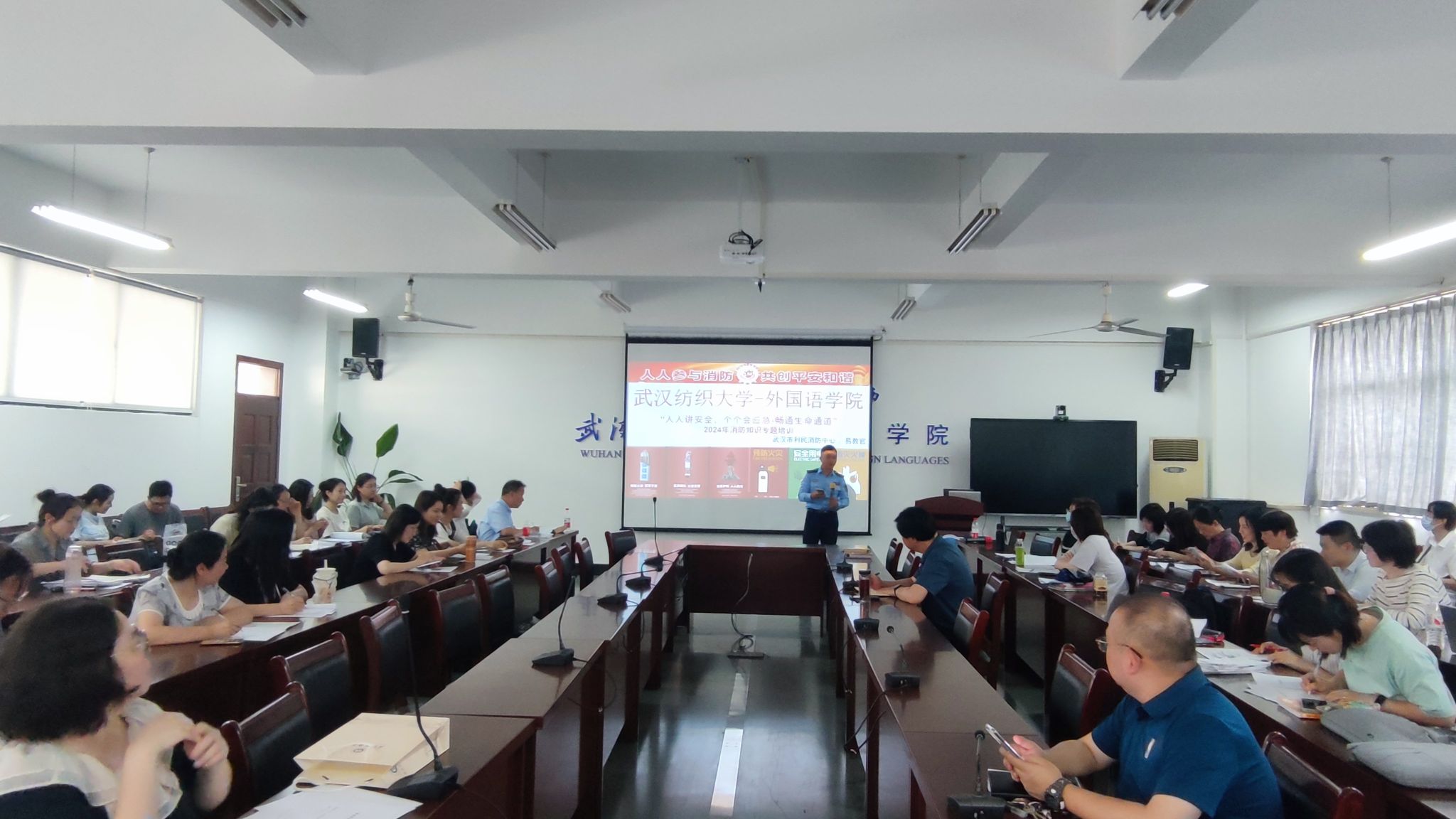 在培训过程中,易教官结合消防安全案例,深入浅出地讲解了火灾的危害性、预防措施以及应急处置方法。他们强调了校园场所的特殊性,指出了在日常工作中需要特别注意的消防安全细节。