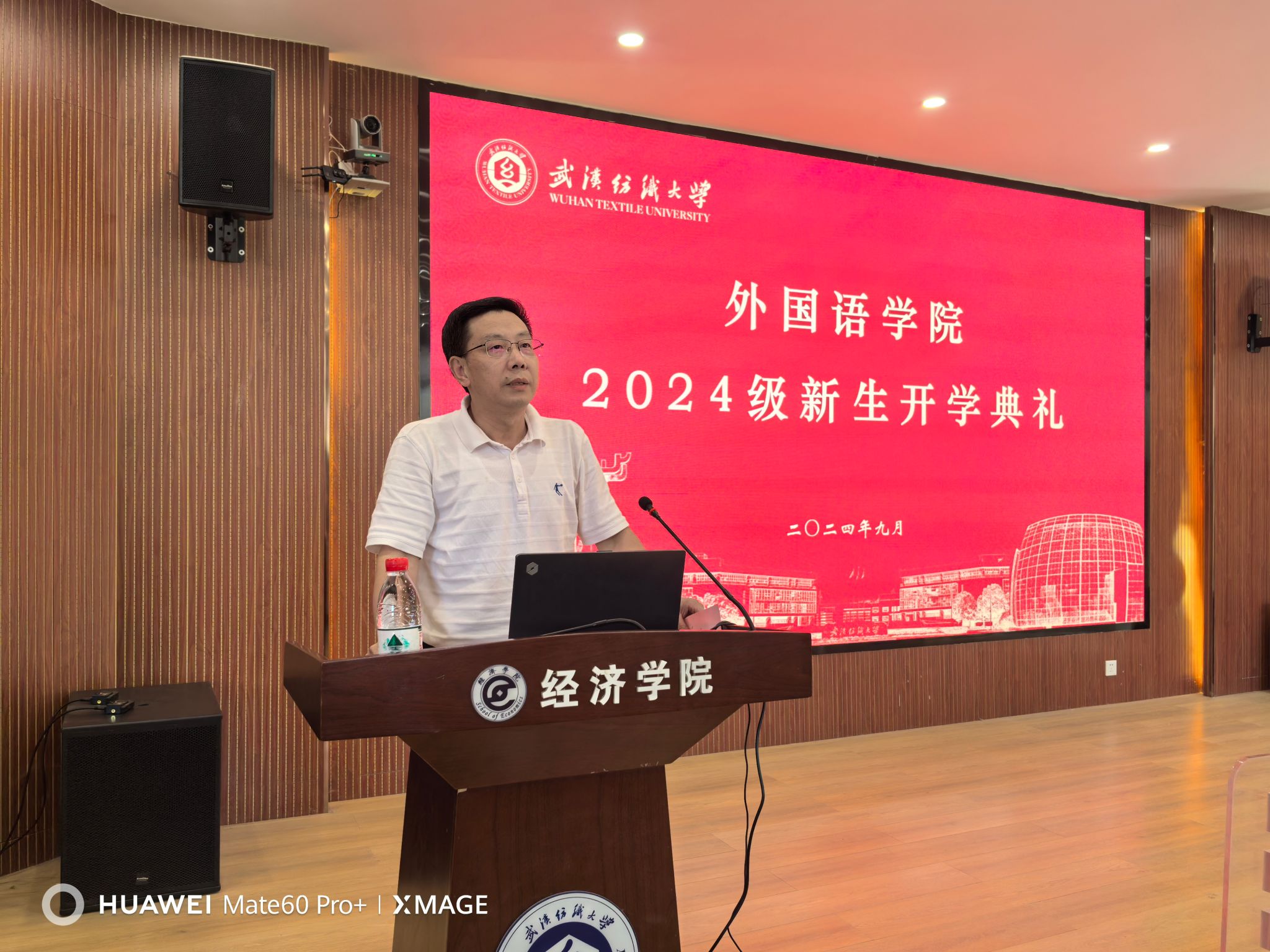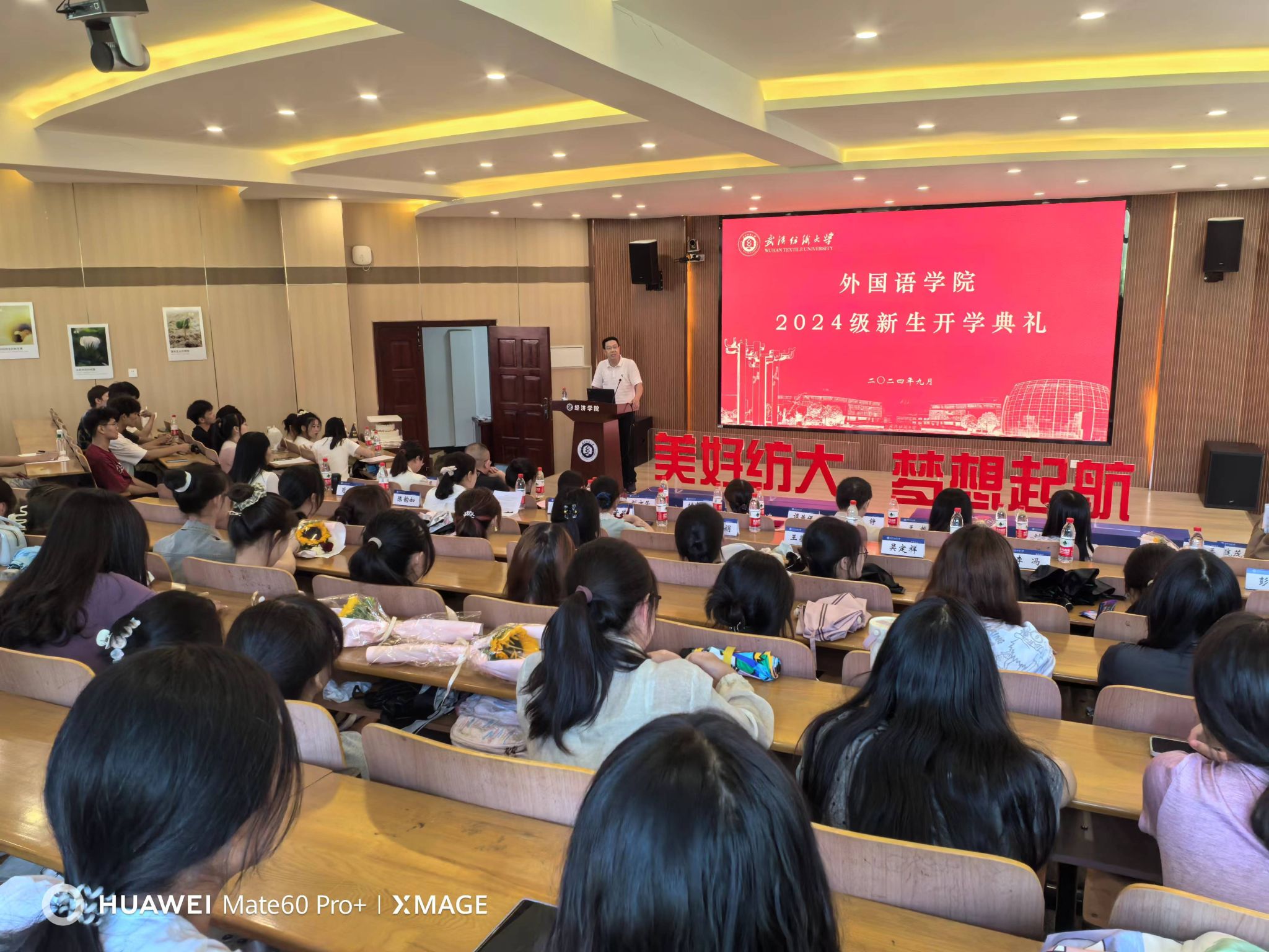 胡中原代表公司欢迎2024级新生的到来,致意全体新生从进入纺大开始就有了“纺大人”这一新身份。胡书记娓娓道来优秀员工的故事和校园环境的点滴变化,鼓舞全体新生在最宝贵的年华、在最美丽的校园养成终身学习的习惯,并用“四新”祝福全体新生:“跨进纺大新校园,谱写外院新篇章,勇攀人生新高峰,再创学业新辉煌。”