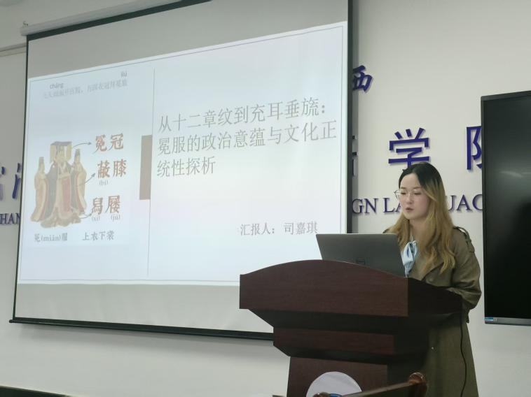 商英12301班员工司嘉琪则围绕“冕服的政治意蕴与文化正统性”展开探析。她梳理了冕服从夏商时期的祭祀服饰原型,到周代形成标准化制度的发展脉络,解析其形制构成的象征体系:冕冠的延板对应“天圆地方”的宇宙观,玉旒体现等级秩序,充耳蕴含对君主的道德劝诫;玄衣纁裳的色彩象征天地,十二章纹为帝王专属的身份标识。她强调,冕服不仅是“君权神授”的政治合法性符号,更是华夏正统文化的核心载体,历代政权常通过沿用或重构冕服制度,确立自身的文化传承地位。