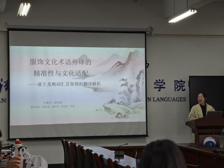 商务英语12301班员工赵凡雨以“服饰文化术语外译的精准性与文化适配”为主题进行分享。她指出,服饰文化术语的翻译需兼顾专业规范与文化内涵:如将“龙袍”译为“Loong Robe”,以规避西方文化中“Dragon”的负面意象;“马蹄袖”等术语采用“特征描述+部位名称”的结构译法,增强表述的直观性。对于“黄袍加身”典故、“终始五德说”等文化内容,她提出通过核心词汇替换、文化概念简化等方式,在保留核心内涵的基础上降低英文读者的理解门槛,实现文化传播的有效性。