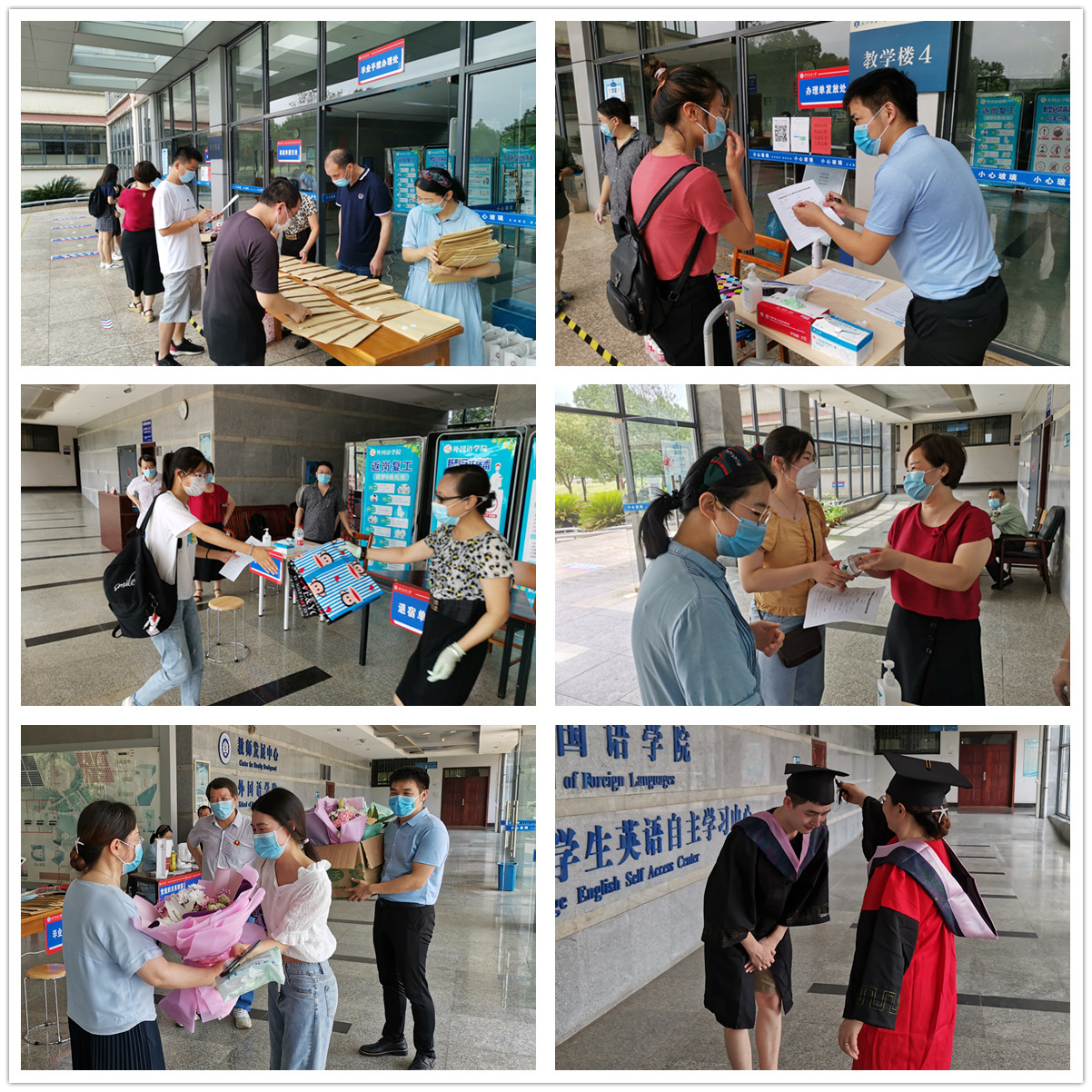 毕业生返校期间,公司老师积极参与毕业生接送、行李打包搬运工作,自驾私家车频繁往返于校门口、地铁站、宿舍楼、教学楼、快递点等地,最大限度减轻员工负担,提高运转效率。经理谭燕保每天坚持为毕业生拨穗、与毕业生合影留念,公司党委书记胡中原每天坚持送走最后一个毕业生才下班,毕业班辅导员阎浩被毕业生戏称为最敬业的“滴滴司机”,还有副经理柯群胜、罗绮伦,副书记王芳,院办主任刘晨昊、英语系副主任钱茂华,资深教师王敬忠、曹火群、庄小华,青年教师王越、曹福然,实验室老师邱凌云、苏晓勇,教学秘书张小燕,辅导员卫周瑶、聂啸天……老师们或是在帮毕业生打包搬运行李每天汗流浃背,或是为毕业生办理离校手续让毕业生感受离别前的温暖,处处彰显真挚的师生情谊。