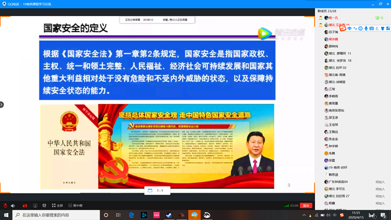 “云”班会分为四个部分,一是集中收看“同上一堂国家安全教育课”,二是辅导员阎浩进行国防安全教育,三是班级交流个人对国防安全、国家安全的认识和思考,三是参加国家安全知识在线问答。期间,不少同学提到:有些大学毕业生由于国家安全意识的薄弱,对危害国家安全的行为缺乏警惕,往往在不经意间泄露国家机密,甚至经不起金钱、美色等种种诱惑,不惜丧失国格人格,出卖情报,给国家安全造成重大损失。发现问题才能解决问题,展开国家安全教育课以及相关主题班会,有助于激发同学对国家安全事件的思考,对他人错误行为的思考与总结。参与此次班会的同学纷纷表示:将进一步增强理想信念和爱国主义情怀,牢固树立国家安全意识,自觉做国家安全的遵守者和捍卫者,为维护国家安全尽一份力量。