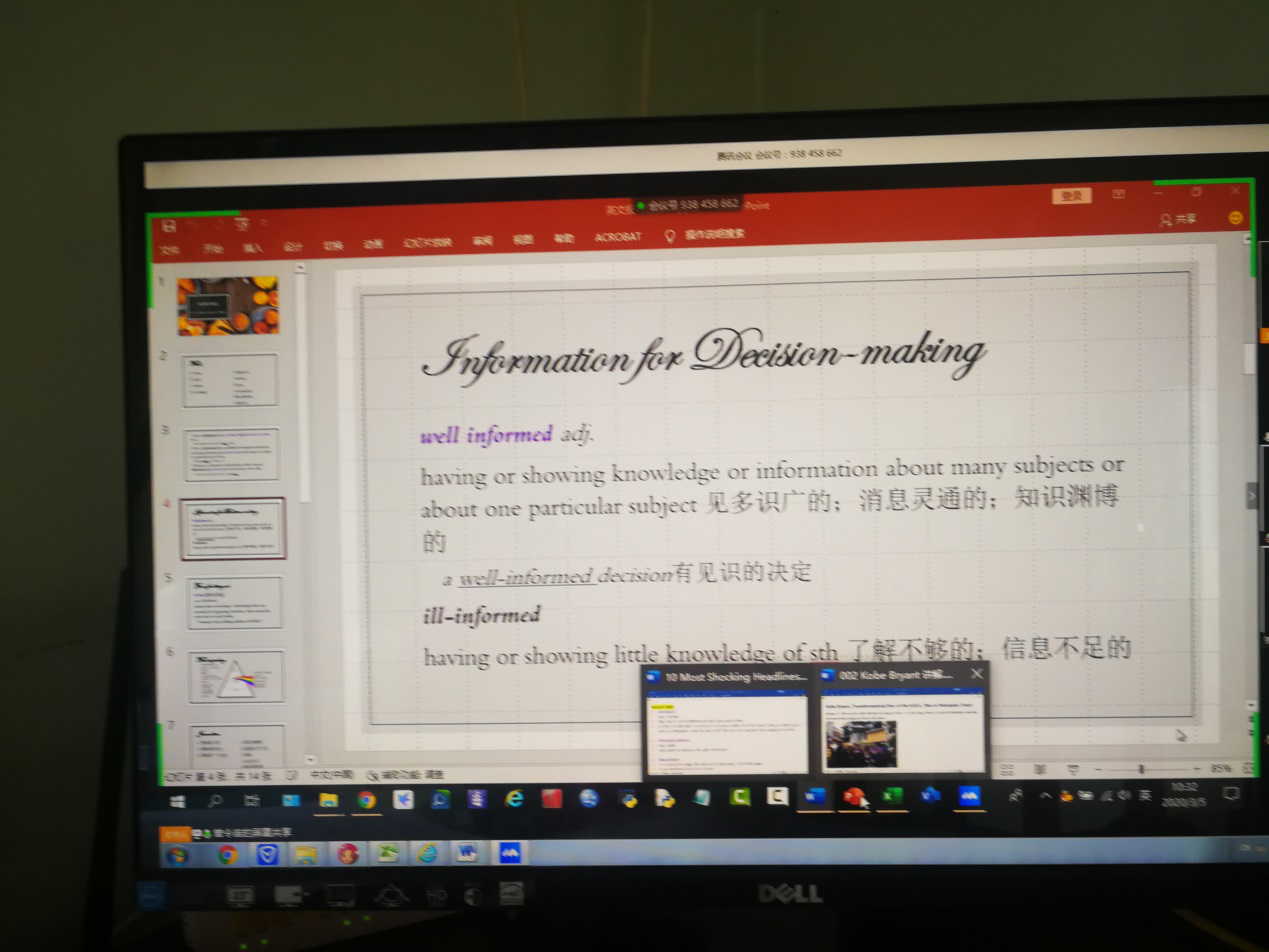 曾令宙老师“英语报刊阅读”课程,采用腾讯会议授课平台,教会员工如何采用谷歌访问助手进入外网,在线查阅“纽约时报”“太阳报”等最新的语料资源,传授翻译技巧,教学资源前沿化,提高员工学习能力,老师投入多,传授知识实用。