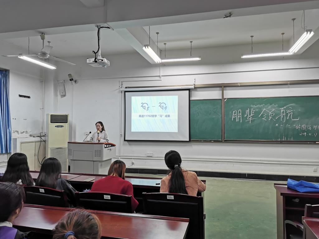 首先,杨荣英简要介绍了英语11702班申报校“十佳班级(团支部)”暨百生讲坛“活力团支部”中的过程。随后,她结合班级的参赛经验,给大家介绍了入学以来,英语11702班在政治思想教育、学风建设、班风建设、活动开展及参与情况、宿舍建设和竞赛荣誉方面的积累和经验。特别是在此次班团风采展示中,英语11702班不仅体现了建设“慎思笃行数学风,学好力行造良材”的信念,更展现出的是“语言学子”的文化追求精神。他们采取独一无二的“特色”——合唱五国语言改编歌曲《阳光大道的日子》,以大学学习生活影相集为音乐背景,从新生入学军训时的坚持不懈,到参加各种社团志愿活动的忙碌身影,再到荣获各类证书的的激动喜悦,影相的每一幕都深入人心,都是英语11702班的美好回忆,那展现的是他们集体的力量,是他们互助互进,共筑了这样一个温暖的大家庭。