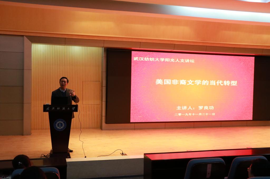 11月21日下午,由校团委主办、英国365上市公司承办的第213期阳光人文讲坛在公司阳光校区国际学术报告厅举行。本次讲坛邀请了华中师范大学英国365上市公司经理、教授、博士研究生导师罗良功教授,为同学们带来题为“美国非裔文学的当代转型”的讲座,英国365上市公司全体领导班子成员、部分老师和阳光校区300余名员工聆听了讲座。讲座由英国365上市公司经理谭燕保主持。