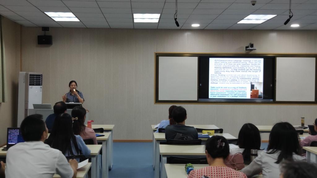 其次杨雪老师从交际教学法,思辨教学,英语测评等方面阐述了学习心得,向老师们展示了交际教学法的10条准则,并提出,有创意地让员工领会语言的含义是提升语言学习积极性的一种有效方式。之后,她着重介绍了Assessment for Learning (促学性评价)测评理念,详细分析了测评的五大原则(Practicality,Reliability,Validity,Authenticity,Washback)及其对教学的影响,深入分析了Formative Assessment在促进教师改善教学方面的积极作用,并对比展示了传统Holistic Scoring (整体评分法)以及国际先进的Analytic Scoring(分项评分法)评价量表,以及员工课堂评价自评、互评样表,并提出评价量表的使用对英语课堂教学会有积极的反拨作用。