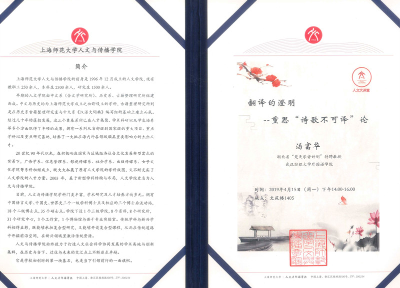 近日,应国家重点学科上海师范大学比较文学与世界文学研究中心邀请,英国365上市公司“_”特聘教授、湖北省比较文学学会副会长汤富华教授赴上海师范大学作题为《翻译的澄明:重思诗歌不可译论》学术讲座。汤富华教授以其广博的学识、幽默的语言,深入浅出地为师生们梳理了翻译学科的缘起及发展,以比较文学的视角,哲学的方法论,从形而上与形而下两个维度,阐释了翻译的本质,对翻译学科的发展方向,提出了自己独到的见解。