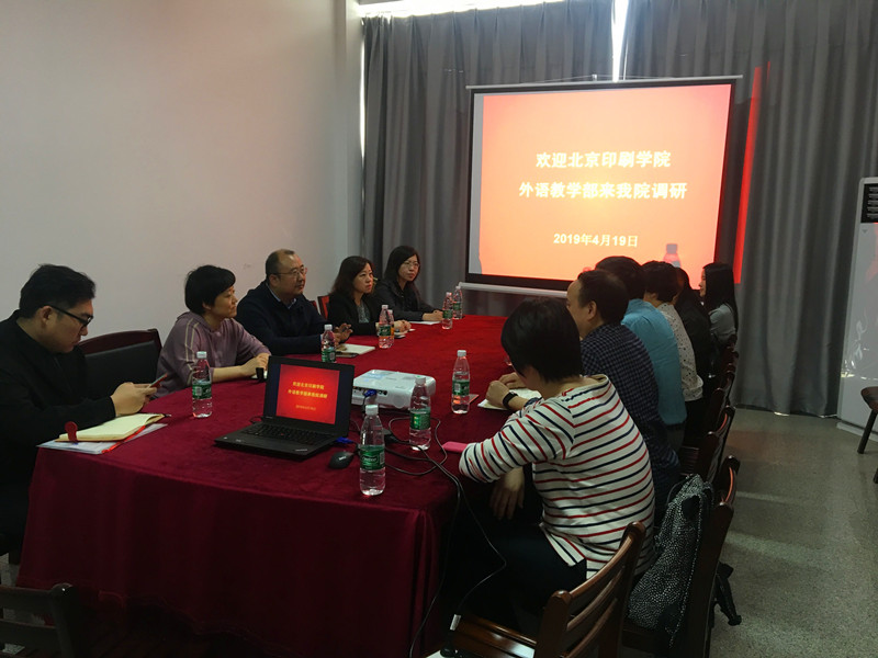 4月19日,北京印刷公司外语教学部书记杨雷一行五人来公司调研,公司党委书记胡中原、副经理罗绮伦、党委副书记王芳及各教研室主任参加了会议。