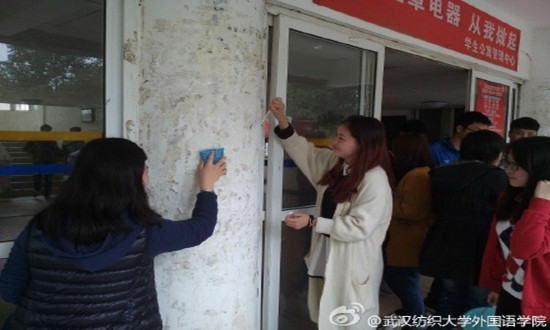 志愿者们下午3:30在大活门口集合,同学们提着水桶,拿着清洁球和塑料袋,在志协同学的带领下来到了一栋宿舍楼。同学们积极认真地对墙上和地上形形色色“顽固”的牛皮癣进行清理,互相合作,有的拿小铲子铲,有的用水桶往小广告上面浇水,有的用清洁球来回刷,齐心协力与“牛皮癣”作斗争。宿舍楼各个角落都随处可见志愿者的身影。