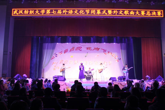 随后,第七届外文歌曲大赛决赛开始。第一轮“秀出自己”环节,十位选手献唱英语、日语、法语、西班牙等外文歌曲,配合现代舞、拉丁舞、爵士舞等精彩伴舞,让整个晚会现场缤纷多彩、热情火爆。在第二轮“挑战自己”清唱环节中,外语公司代索菲带来了希伯来歌曲《Avinu Malkeinu》、惊艳全场,经济公司陈玉带来了意大利语歌曲《times to say goodbye》,带了“歌剧语言”的别样风格。晋级的六位选手都亮出了他们不俗的歌唱功底和语言能力。最后一轮“梦想成真”,冠军争夺战环节,来自传媒公司的李翔宇,管理公司的蒋楠和经济公司的陈玉角逐最后的冠军。最终,李翔宇以一首《just one last dance》技压全场、夺得冠军。此外,通过近一周的场内外观众现场和微博投票评选,会计公司宋锦获评“最佳人气奖”。