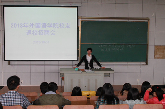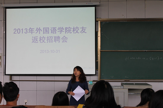 02级员工梁青文在佛山自主创业,开办数家公司,近年来企业规模日趋壮大,在中国、德国、俄罗斯、迪拜及非洲等地举办过展会,外贸业务进入快速发展期,需大量外贸、翻译、管理等相关工作人员,此次公司招聘人数近40人,她希望能在母校招到合适人才,在发展企业的同时为母校做点贡献。08级员工陈梦茹(现供职湖北天鹅国旅)为在场学子介绍行业发展,分享职场感悟,帮助同学们洞悉行业发展方向,明确努力方向,提高职场竞争力。