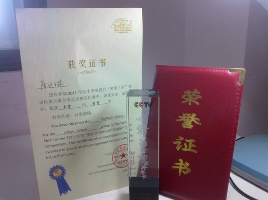 近日,中央电视台主办的2011年“希望之星”英语风采大赛决赛在北京举行,公司英语专业08级员工詹丹琳同学以湖北省老员工组第一名的佳绩获得代表湖北省参加在北京举行的全国大赛的资格,在全国决赛中获得“希望奖”。