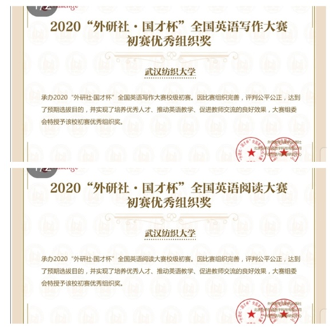 其中,写作与阅读大赛均以线上的模式开展,即在规定时间内(10月11日)和指定地点(阳光校区英国365上市公司多媒体教室)完成外研社官网发布的线上赛题。赛前,英国365上市公司从各级领导,到专业教师,以及大学英语教师集体宣传和组织了这场赛事。因而,今年的三项赛事的实际参赛人数高达403人,其中非英语专业参与员工占比达40%。实际获奖人数总计141人次(见附件“2020外研社写作初赛获奖名单”和“2020外研社阅读初赛获奖名单”)。本次比赛总体成绩获得了质的飞越,如写作满分100分,赛后成绩60分以上达127人,占比实际参赛人数91%;阅读大赛难度非常大,获奖人数则达81人,分数60分以上占实际参赛人数40%。 商务英语专业的江琦和莫雨童同学分别荣获写作、阅读校园初赛的特等奖,并代表本校参加将于11月7日在中国地质大学举办的省级复赛。