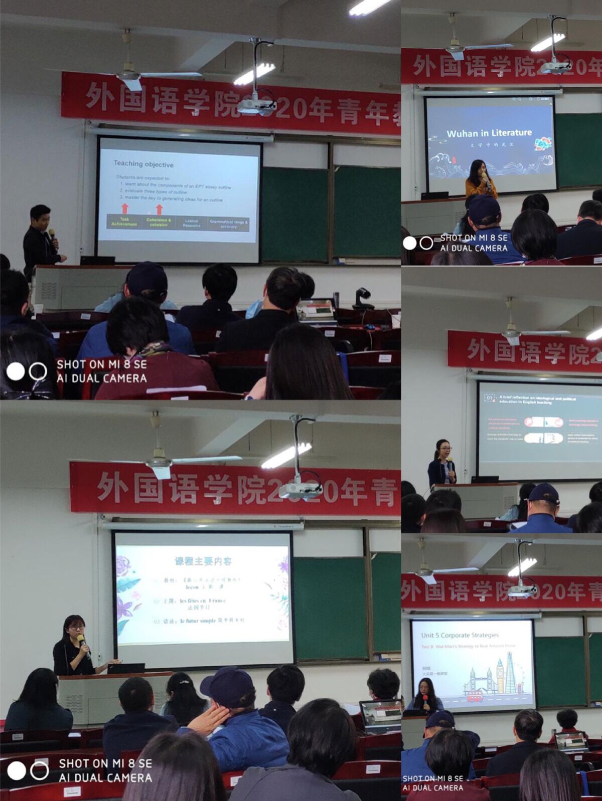 各参赛老师展现了风格多样,精彩纷呈的教学内容。郭婧老师讲授经管类学术英语,通过比较沃尔玛和亚马逊的会员制,复盘了大企业的商业策略。邵嘉老师贴合雅思写作实战,从语言的衔接与连贯,词汇选择等角度分析了如何陈述观点。王越老师贴合时势,呈现了英语专业的课堂思政。余演老师的课堂带领大家走进了一个文学的武汉,再现了武汉文化的精彩与历史流变。袁哲老师讲解了法国的节日,课堂别具法国风情。