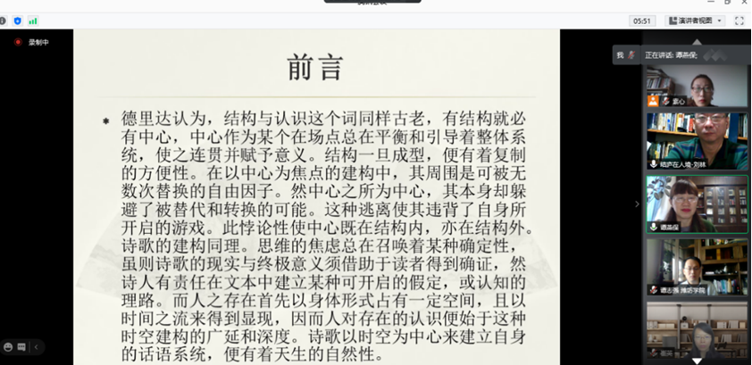 谭燕保教授在主旨发言一开始就提到结构互文性的概念,进而向在线师生简述斯奈德翻译寒山诗的背景。从翻译寒山诗开始,斯奈德便一直在寻求完成自身救赎。谭教授特别指出了在精神内核层面,两者在不同时空维度下的相同点,从圆形的时间和圆锥结构两个层面阐述了斯奈德翻译寒山诗的互文内涵。