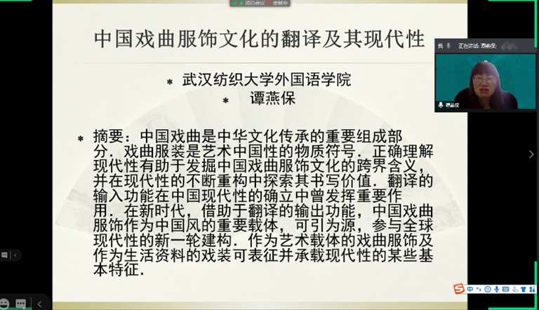 谭燕保教授的《中国戏曲服饰文化的翻译及其现代性》融合了她的比较文学研究及翻译实践探索。在发言中,谭燕保教授以“中国戏曲是中国传统文化的重要载体,其服饰是研究中国传统文化的标本”为基础,阐释了翻译的输出功能及中国传统戏曲服饰文化翻译参与现代性建构的内因及有效方式。以戏曲服饰文化的翻译为样本,谭教授分析了将中国优秀传统文化推向世界的有效手段。