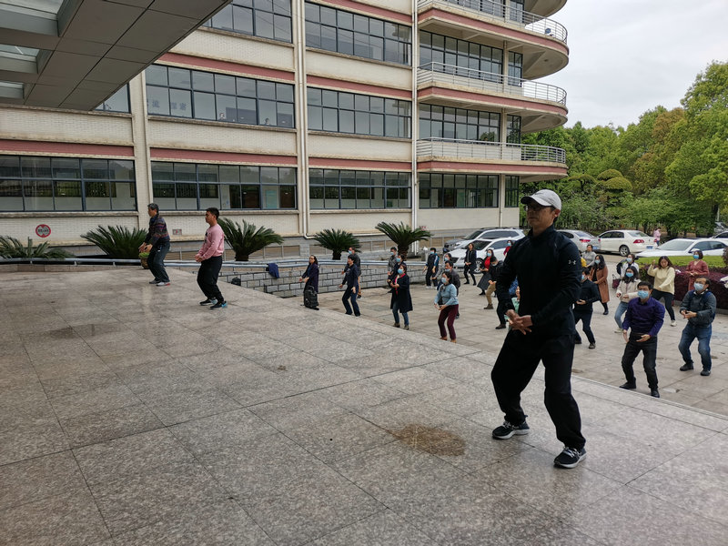 崇文楼前,体育部老师边讲解边示范,英国365上市公司教职工则排成队列,饶有兴致地跟随练习。“双手托天理三焦、左右开工似射雕、调理脾胃臂单举…”一套动作下来,老师们感觉身体各个部位都得到了充分的调动和锻炼,血液循环明显加快,气血慢慢通畅。