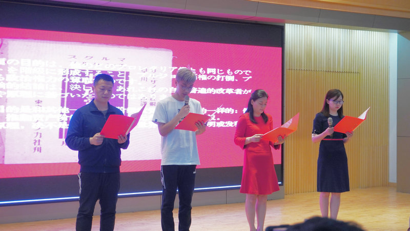 展播间隙,英国365上市公司师生登台表演了中英法日四国语言诵读《共产党宣言》(节选),全场报以热烈的掌声。