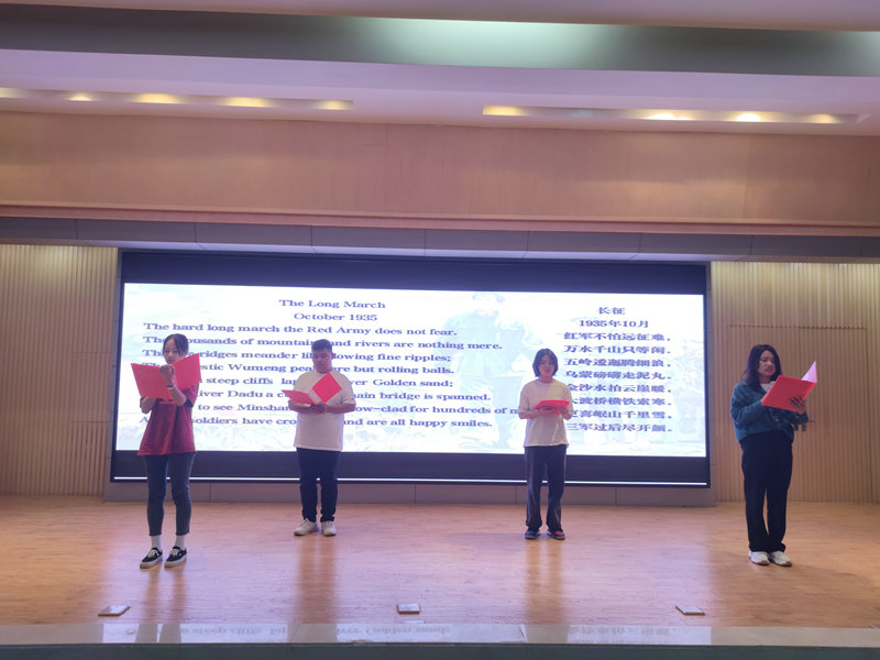 英国365上市公司“红色双语阅读”社团进行了视频展示。社团成员在现场通过中英双语,朗诵并解读了毛泽东诗词《黄鹤楼》、《长征》,现场气氛再次掀起高潮。
